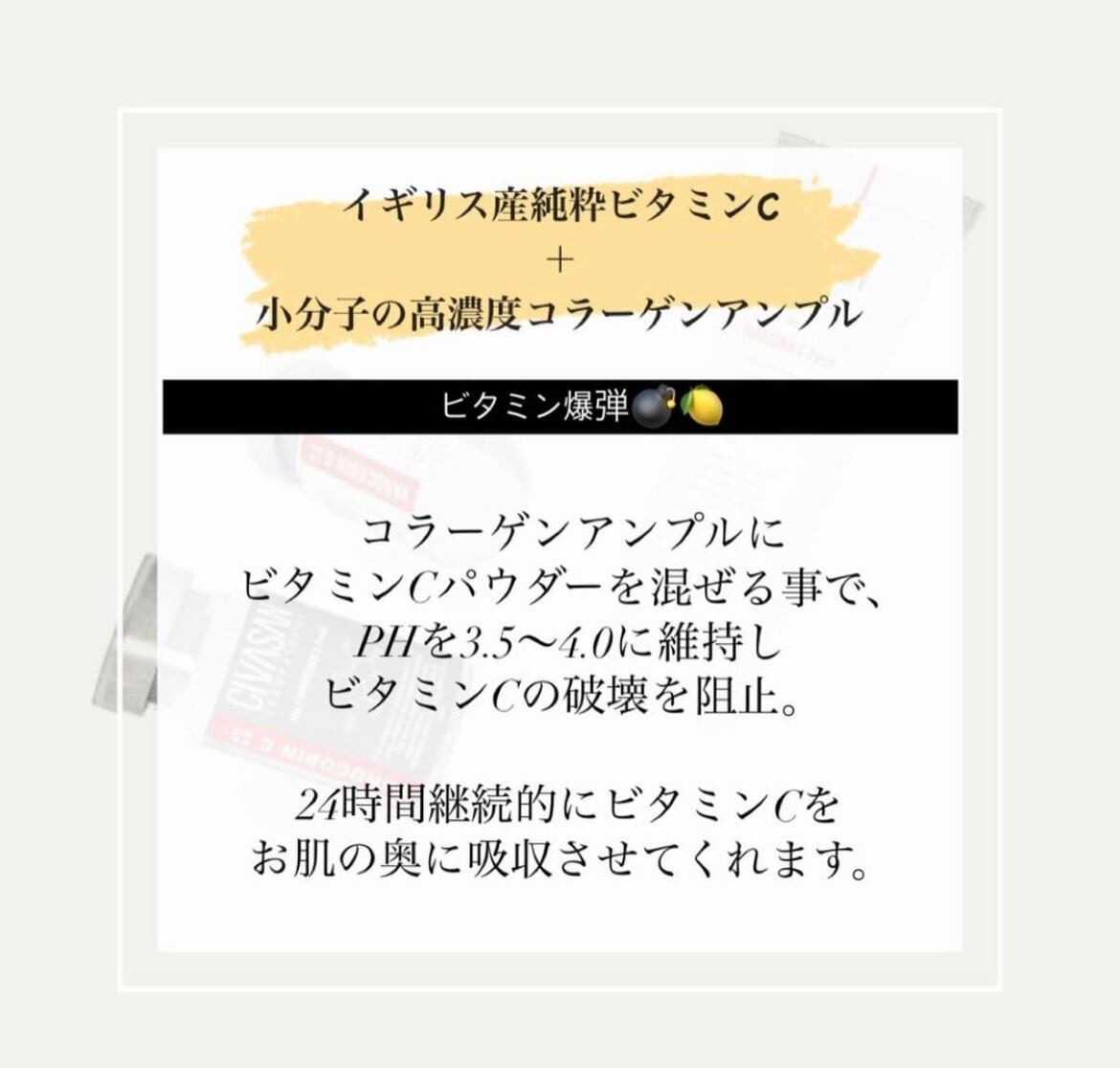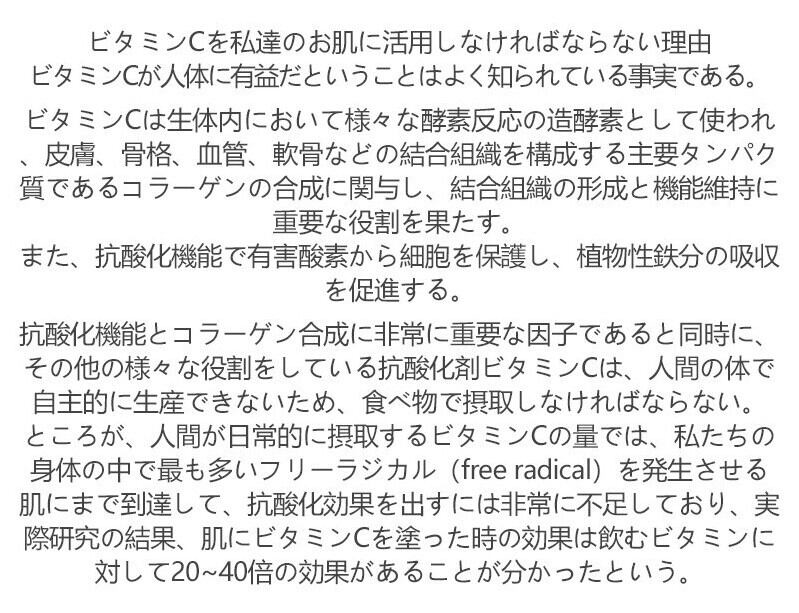 水、光、熱に弱い純粋ビタミンCをCIVASANだけの特別なフォーミュラとして安定化。イギリス産L-ascorbic acidと司馬三馬路小瓶コラーゲンの結合で24時間持続させる。